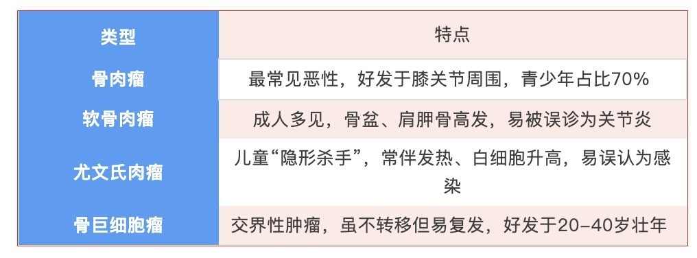 r(2)恶性骨肿瘤:俗称“骨癌”,侵袭性强,易转移(如骨肉瘤)。③